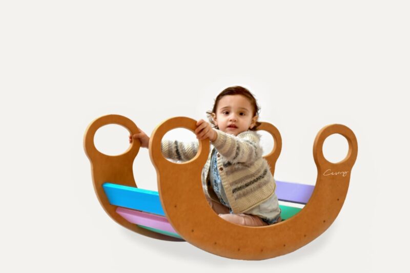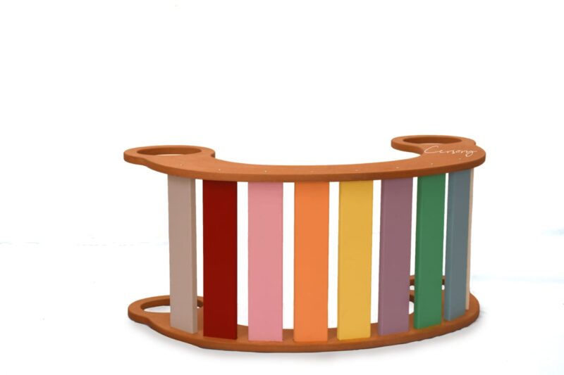 El balancín arcoíris está hecho de MDF de alta calidad, que garantiza su resistencia y durabilidad. La pintura utilizada es no tóxica, lo que la hace segura para los niños. Además, las esquinas y bordes están redondeados para evitar lesiones y garantizar un juego seguro y cómodo.