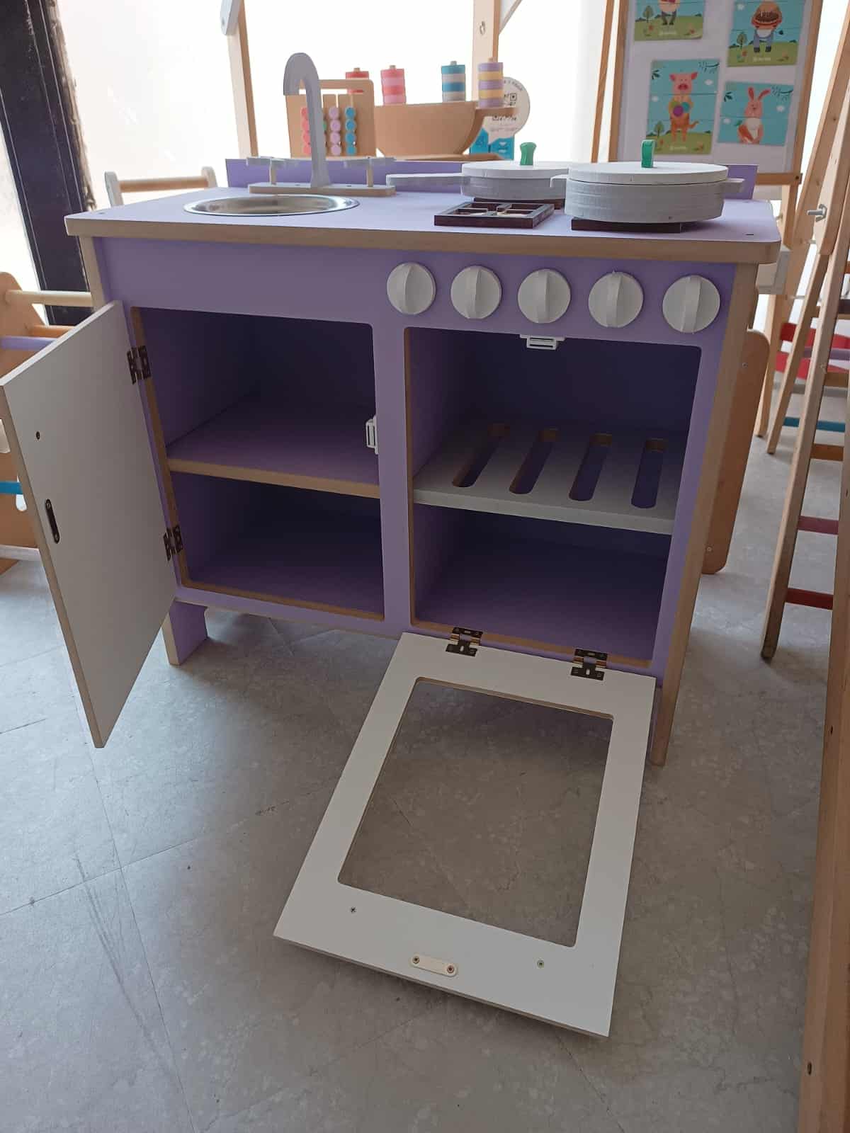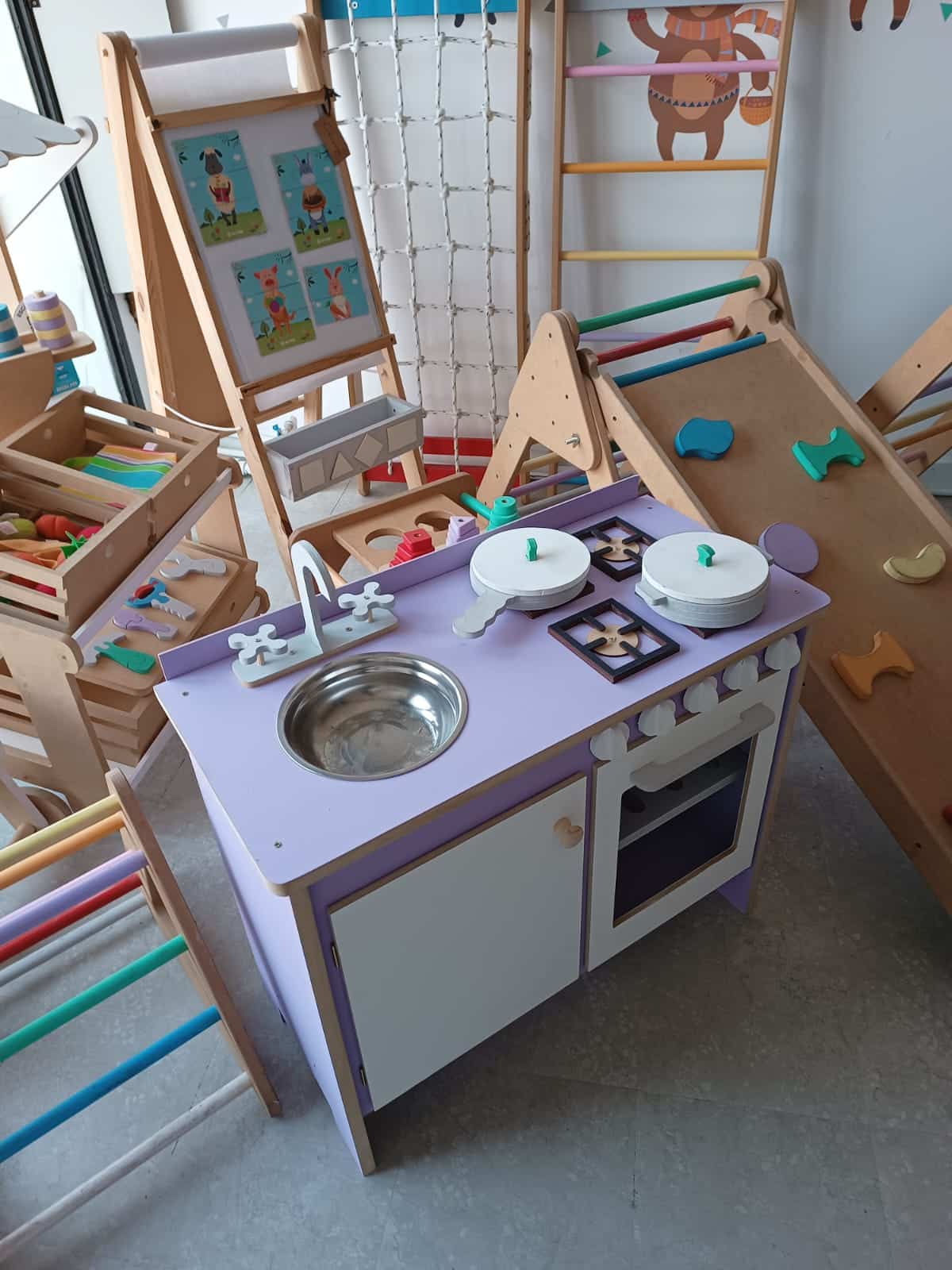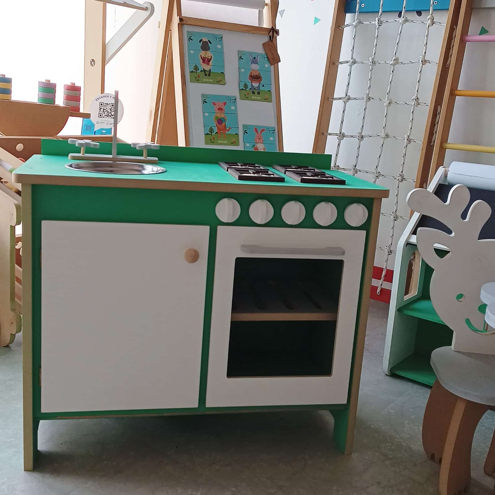 Jugar con una cocinita de madera de juguete también puede ayudar a los niños a desarrollar habil