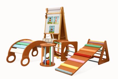Pizarra 3 en 1: Ideal para volar la imaginación y suspender el uso de pantallas. Triángulo: Se recomienda a partir de que empiezan a caminar. Su forma estimula el desarrollo motriz y el equilibrio del niño de forma segura. La Rampa: Uno de sus lados se puede usar como escalador, y el otro lado, como deslizador. Cubo Pikler: Se recomienda a partir de que empiezan a caminar. Las diferentes caras del cubo estimulan la motricidad y equilibrio del niño. Una de las caras del cubo dan la posibilidad de usarlo como apoyador/mesita. Balancín: favorece el equilibrio y la conciencia de estar en un cuerpo físico. Además, acompaña la mente de los peques, manteniendo activa la creatividad y la capacidad imaginativa. Este balancín puede ser una hamaca, una nave, un barco…o lo que ellos quieran! Rodari: Se recomienda su uso desde que gatean. Ayuda a estimular la motricidad gruesa y fina ya que sirve para perseguirlo haciéndolo rodar, pueden agitarlo o tirarlo para escuchar el ruidito de las pelotas.