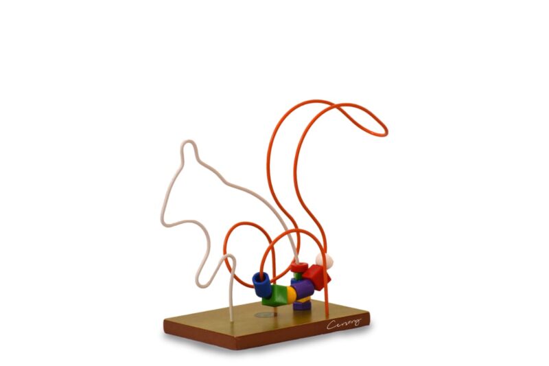 Posee piezas plásticas con diversas formas geométricas y colores, enhebradas sobre coloridos rieles metálicos. Todo se encuentra montado sobre una base de madera rectangular.