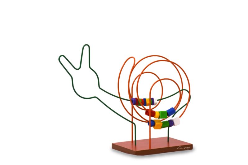 Posee piezas plásticas con diversas formas geométricas y colores, enhebradas sobre coloridos rieles metálicos. Todo se encuentra montado sobre una base de madera rectangular.